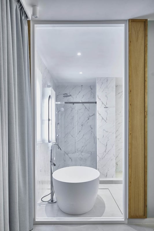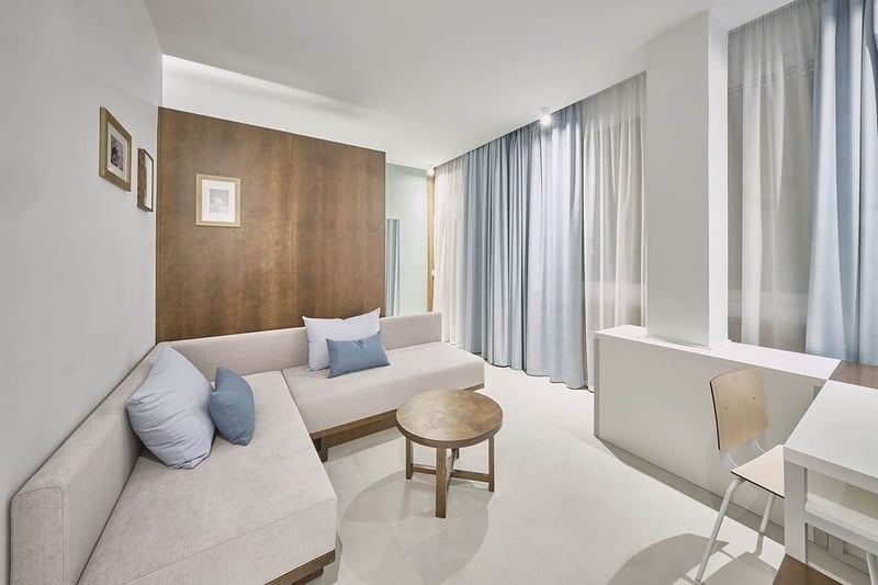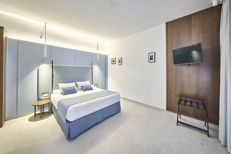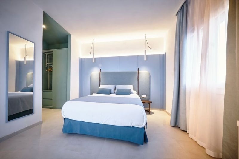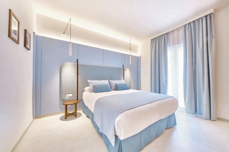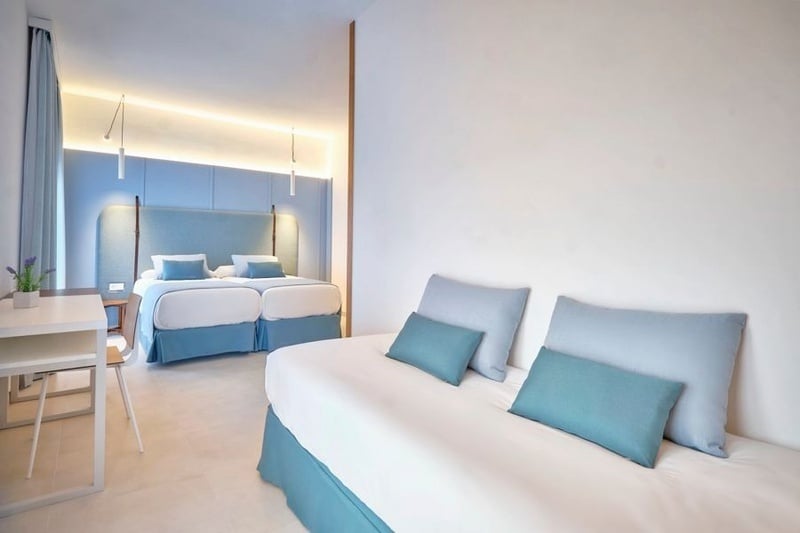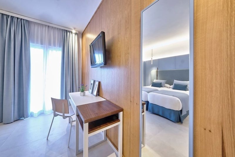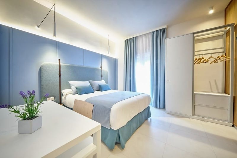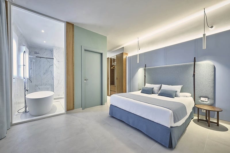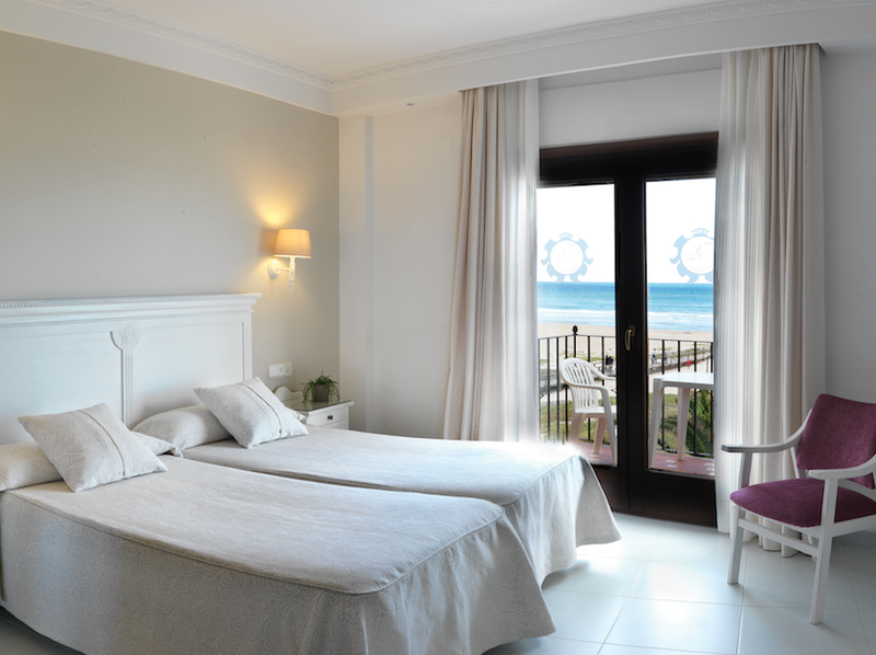 Habitación doble con un amplio balcón con vista lateral al mar.